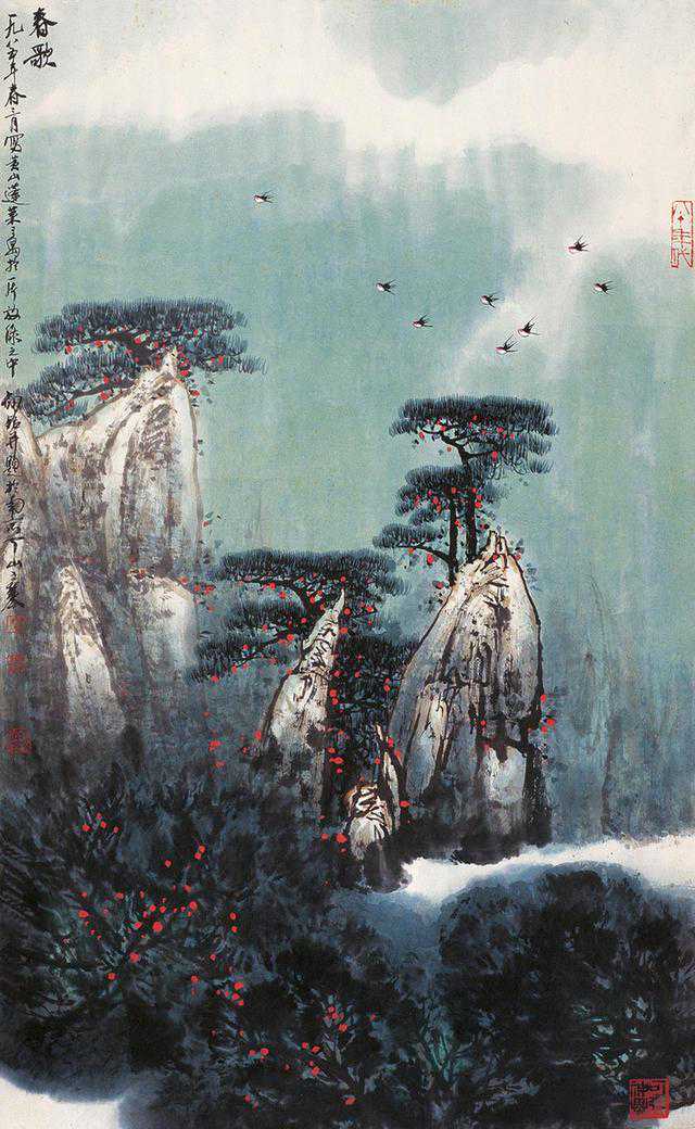 芳草乍疑歌扇绿,落英错认舞衣鲜。