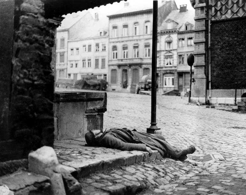 ▲1945年1月2日,在比利时-卢森堡突出部作战期间,一名德军士兵被射杀在比利时斯塔沃洛(Stavelot)的街角。