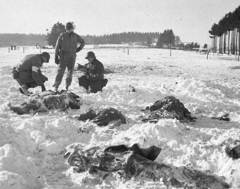 ▲1945年的1月,美军正在比利时的马尔梅迪(Malmedy)辨认被德军射杀的美军士兵,此地曾发生了德军屠杀750余名美军士兵和150余名比利时平民的"马尔梅迪大屠杀"。