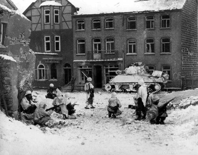 ▲1945年1月23日,美军第七装甲师在圣威思(SaintVith)的大街上寻找德军狙击手
