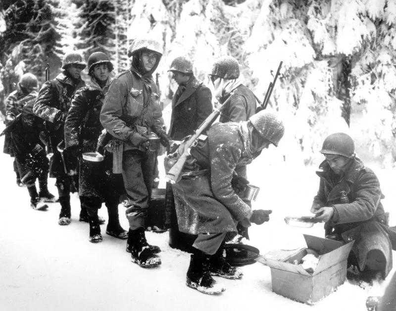 ▲1945年1月13日,美军第347步兵团的士兵身着厚厚的冬装在比利时的拉罗什(LaRoche)地区停下脚步吃一顿饭。