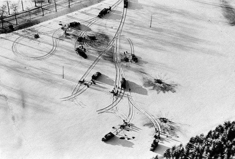 ▲1945年1月27日,从空中俯瞰一支盟军车队,地面上重炮砸的的炮弹坑清晰可见。