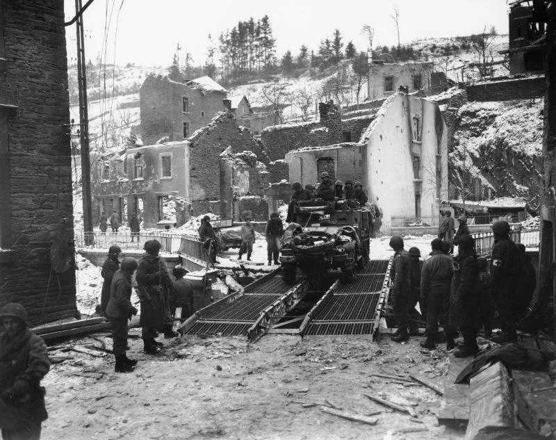 ▲一辆美军的半履带车正在通过一座临时铺设的桥梁。照片摄于1945年1月,地点位于比利时的胡法利兹(Houffalize)
