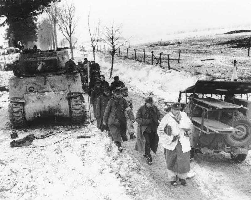 ▲1945年1月25日,一队德军俘虏走在通往战俘营的路上,旁边是一辆被丢弃的美军坦克。