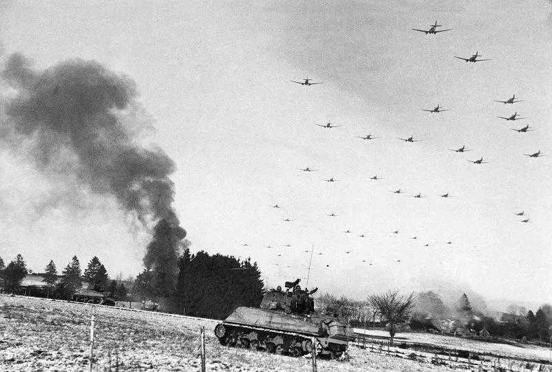 ▲1945年1月6日,一群低飞的C-47运输机希望向被围困在巴斯托涅的盟军部队空投补给。地面上,远处的德军坦克还在冒着滚滚浓烟,美军坦克正在掩护步兵前进同德军展开激战。