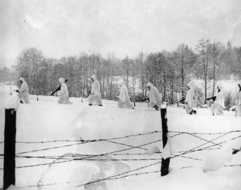 ▲1945年1月14日,第30步兵师的野战炮兵小队在斯塔沃洛附近的前线涉雪前进。