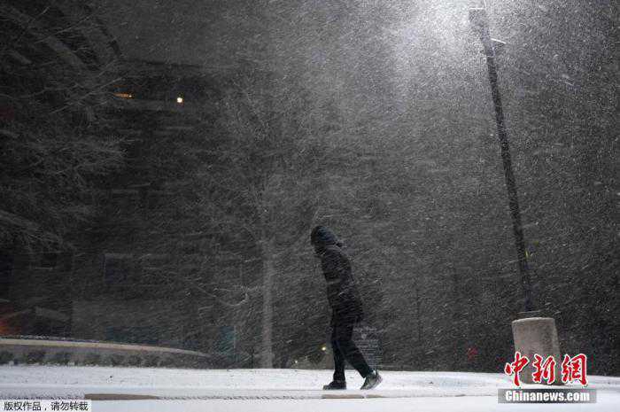 当地时间2月15日,美国得克萨斯州遭遇冬季风暴袭击,全州气温均低于零摄氏度。图为一名行人走在暴风雪中。