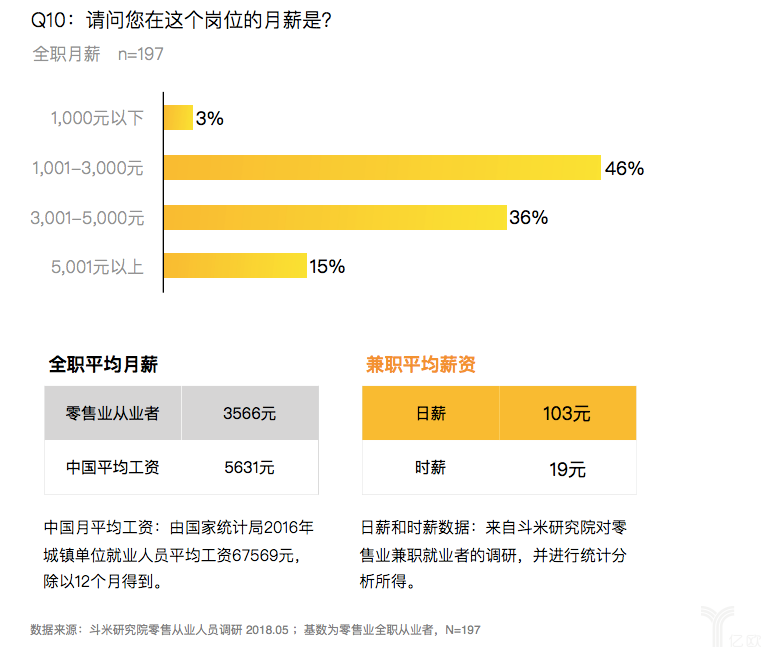 而造成流失率高的原因,并不是因为“不喜欢”,而是在于“不满意”。工资待遇低、工作强度大、各项福利享有率低是零售业员工面临的首要问题。斗米研究院通过调研发现,零售业中全职从业者薪资水平比较低,月平均工资为3566元,远低于国家城镇平均工资,而兼职人员的时薪和日薪也不高,辛苦程度与收入水平远不相称。