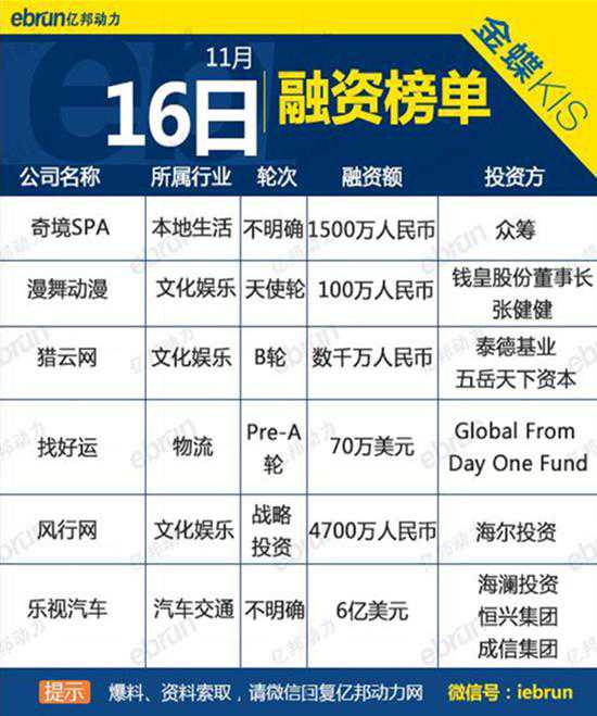 获投企业和投资方介绍:1.奇境SPA业务介绍:奇境SPA是一个连锁养生品牌,以互联网思维为基础,采用台湾精品酒店的主题式装修风格,并将精油SPA、电影、红酒及音乐融为一体。近日,奇境SPA获得1500......