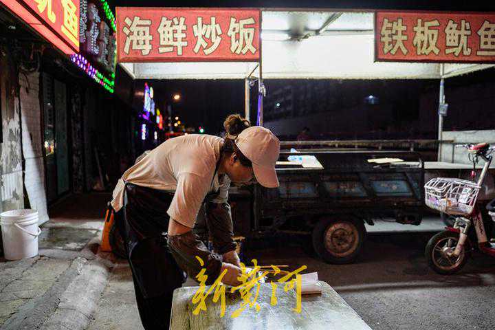 夜里10点,红黄相间的“海鲜炒饭铁板鱿鱼”招牌灯火通明。店门口的空地上,随意地摆着小桌和马扎。此时,已有3桌食客正在喝扎啤吃炒饭,他们哈哈笑着,用济南方言吐诉着平日里遇到的趣事和埋藏在心底的话语。