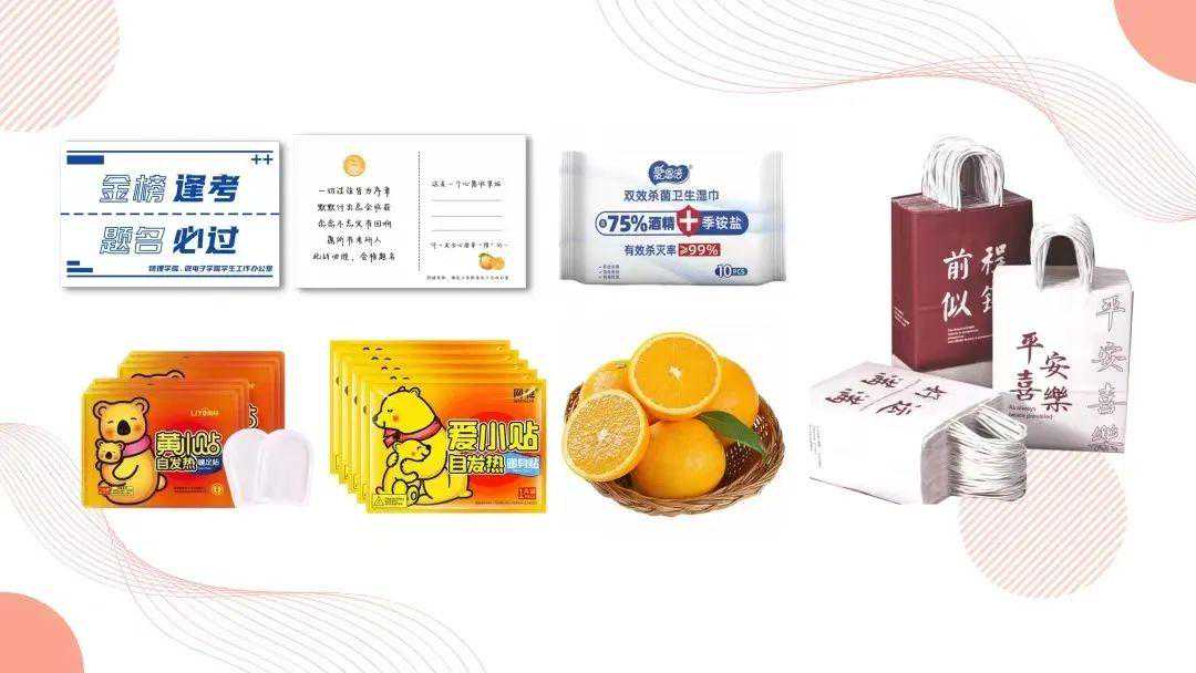 化学化工学院考虑到学生考研时正值冬季,天气较寒冷,久坐答题容易手脚冰凉,特为学生们准备了“冬日暖心大礼包”,有8张身体暖宝宝贴、4副艾草暖足贴、1包医用口罩、1个便携笔袋,寓意考研学子心怀温暖,轻松上阵。