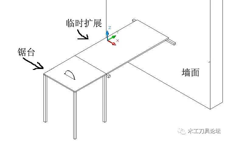 我们这里大部分木工是支好腿后测出锯台高度,然后在另一侧墙面钉一个同样高度的木条,在木条与锯台之间放一块大芯板,当台面扩展了,