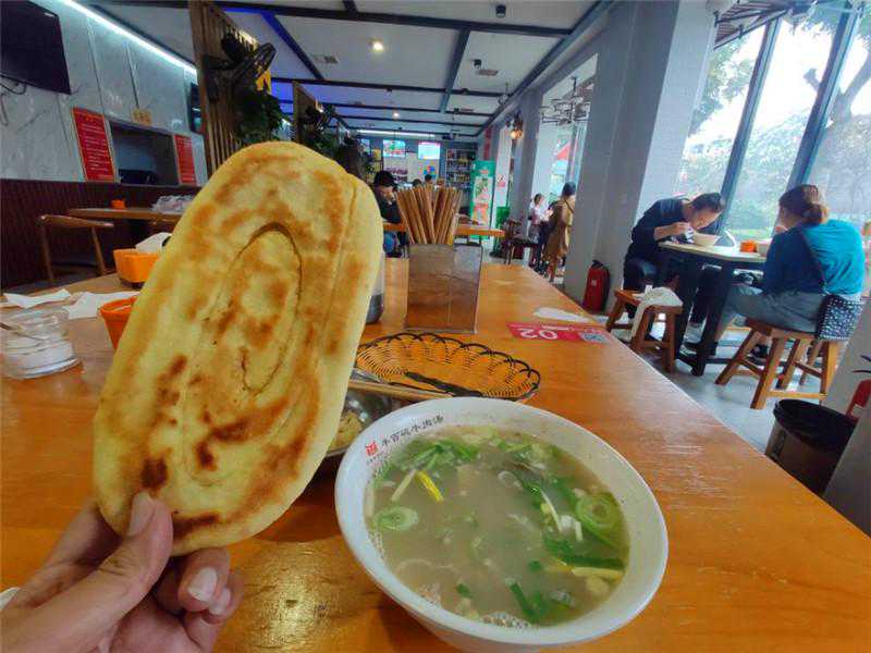 这个饼是咸味的,热的时候好吃,凉的时候口感筋筋的。今天手拿着饼、就着汤,边吃边喝。