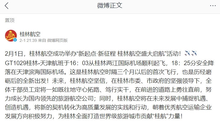 2月1日下午,桂林航空启航仪式在桂林两江国际机场隆重举行,桂林航空GT1029航班从桂林起飞前往天津。这意味着停航近3个月的桂林航空正式复航。当天桂林市市长李楚出席活动并宣布启航。