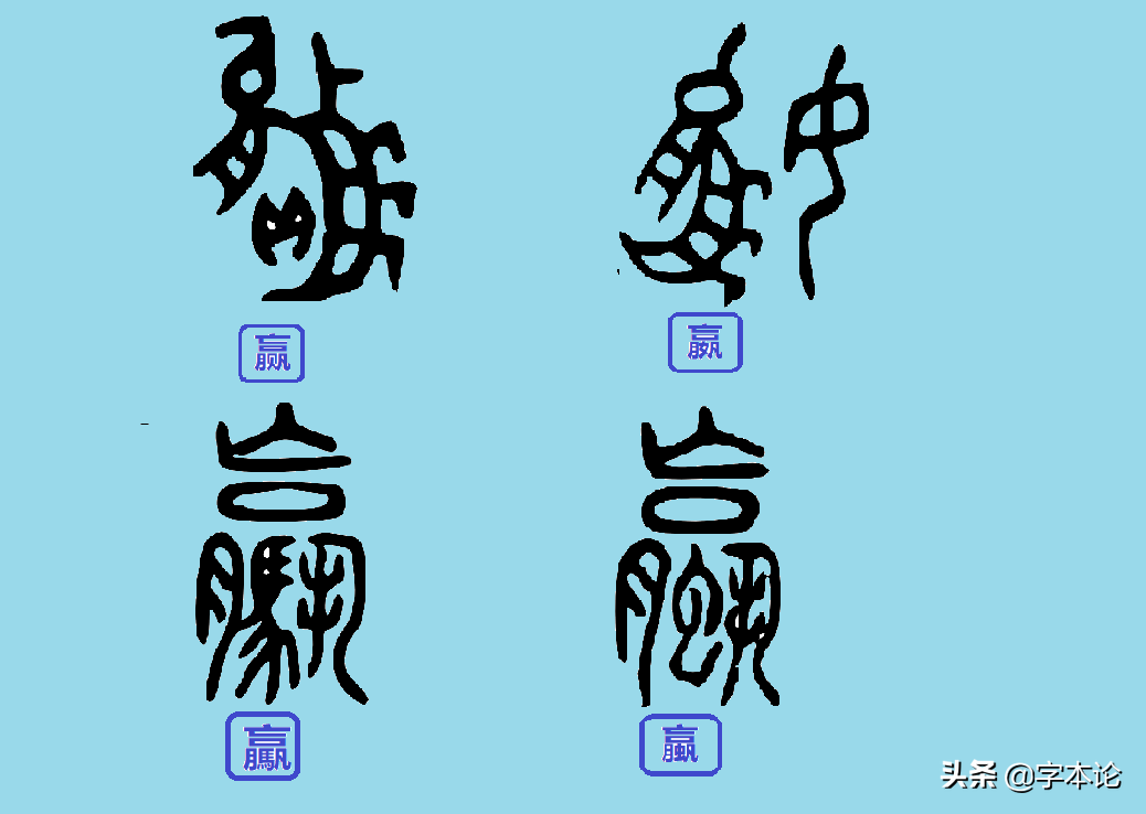 以上四字赢、嬴为金文,驘、䇔则为篆书。通过金文我们可以清晰地看出赢、嬴所从共同形旁如下: