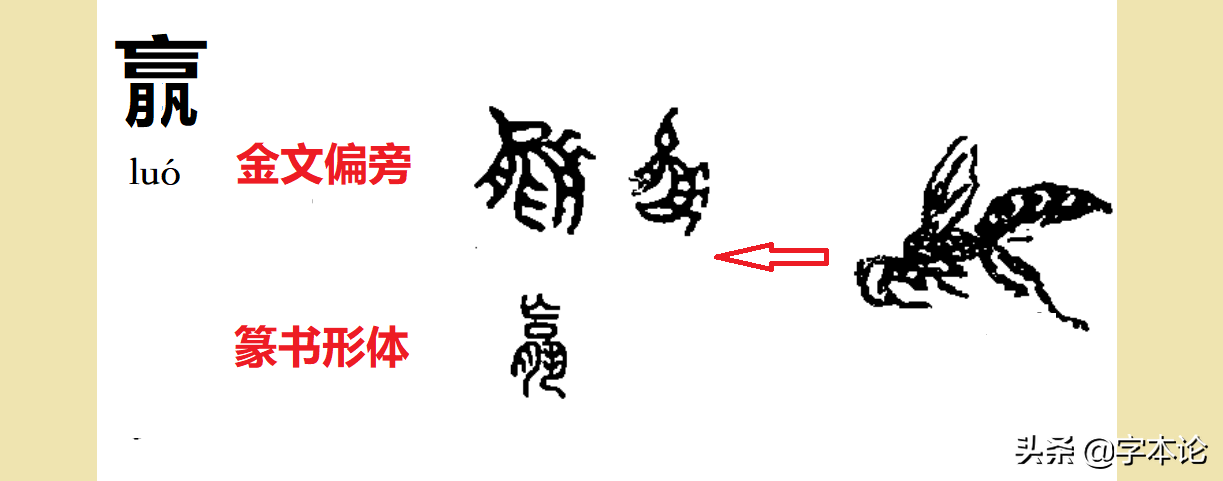 赢、嬴、蠃、驘、鸁、䇔、䊨等字所从luo字,为象形字,金文形似有头有尾、有翅膀、有足、且身上有花纹、细腰大腹的昆虫,据说是一种蜾蠃。只不过发展至篆书、隶书事物形体逐渐消失了,头部演变成了“亡口”,形似翅膀的部位变成了“月”,而腹部则演变为了“凡”字。