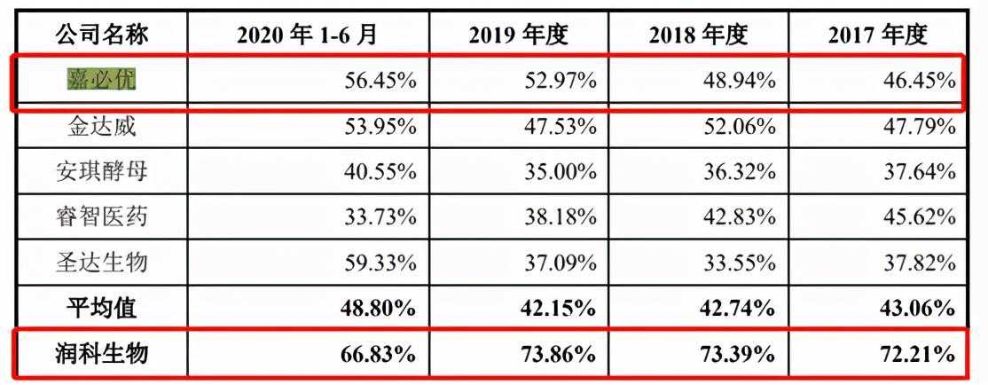 值得注意的是,润科生物与同行业可比公司相比仍处于领先地位。2017-2019年,润科生物的毛利率超过同行均值约30个百分点。报告期内,与润科生物产品及业务相似的嘉必优毛利率均值分别为46.45%、48.94%、53.97%和56.45%。