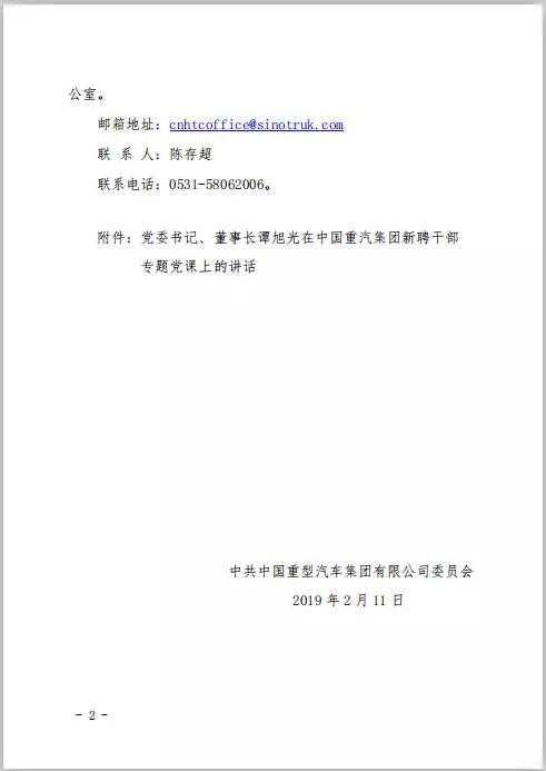 2月10日,中国重汽集团举行新聘干部专题党课暨2019年绩效合约签字仪式,山东重工集团党委书记、董事长,中国重汽集团党委书记、董事长谭旭光作专题党课,对新竞聘上任的64名各单位主要领导干部提出要坚定信仰、追求梦想、挑战自我、优胜劣汰的四项要求。讲话以中国重汽党字〔2019〕13号文件下发,要求全体员工认真学习、深刻领会,全力推进改革创新发展,为打造世界一流中国重汽品牌作出新的更大的贡献。