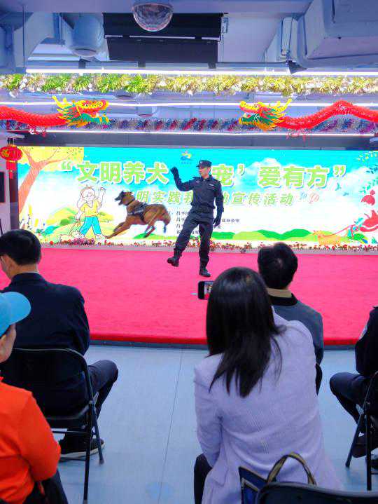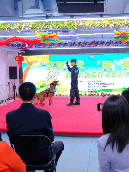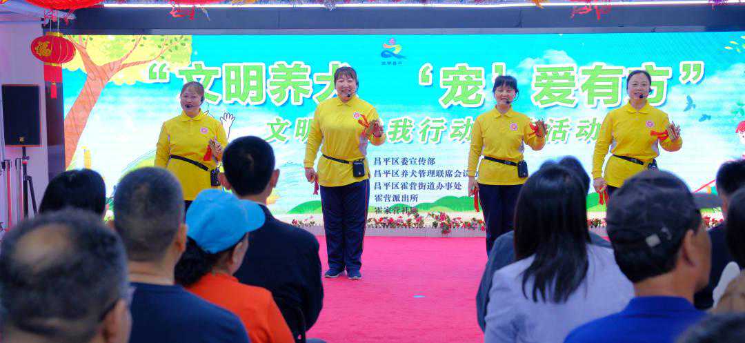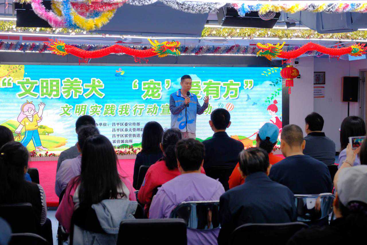为进一步规范社区文明养犬行为,加强社区养犬管理,和谐邻里关系,引导居民依法、文明、科学养犬,共建安静舒适的生活环境,4月26日上午,昌平区委宣传部联合昌平区养犬管理联席会议办公室、昌平区霍营街道办事处、霍营派出所等单位,采取“科普”+“百姓”+“文艺”的形式,在霍家营社区新时代文明实践站开展“文明养犬‘宠’爱有方”宣传活动。昌平区委宣传部四级调研员马俊高、昌平区新时代文明实践中心负责人张俊杰、昌平治安支队公共秩序管理中队中队长吴凯、霍营街道党群工作办公室科长朱培、霍营派出所副所长杨宁、回龙观仁心动物医院院长李丹、霍家营社区党委书记李宝忠以及80余名霍家营社区居民、文明养犬志愿者参加。