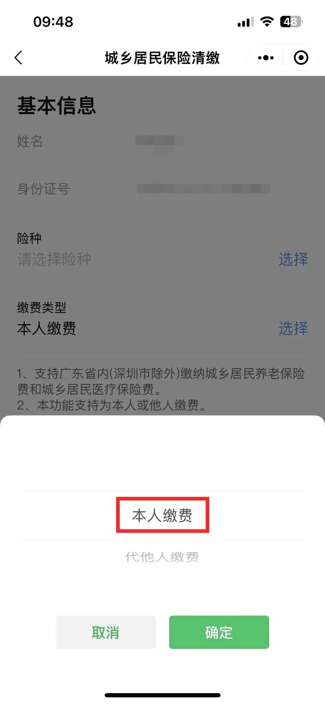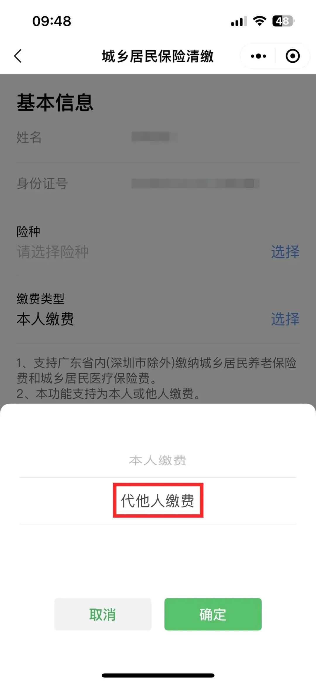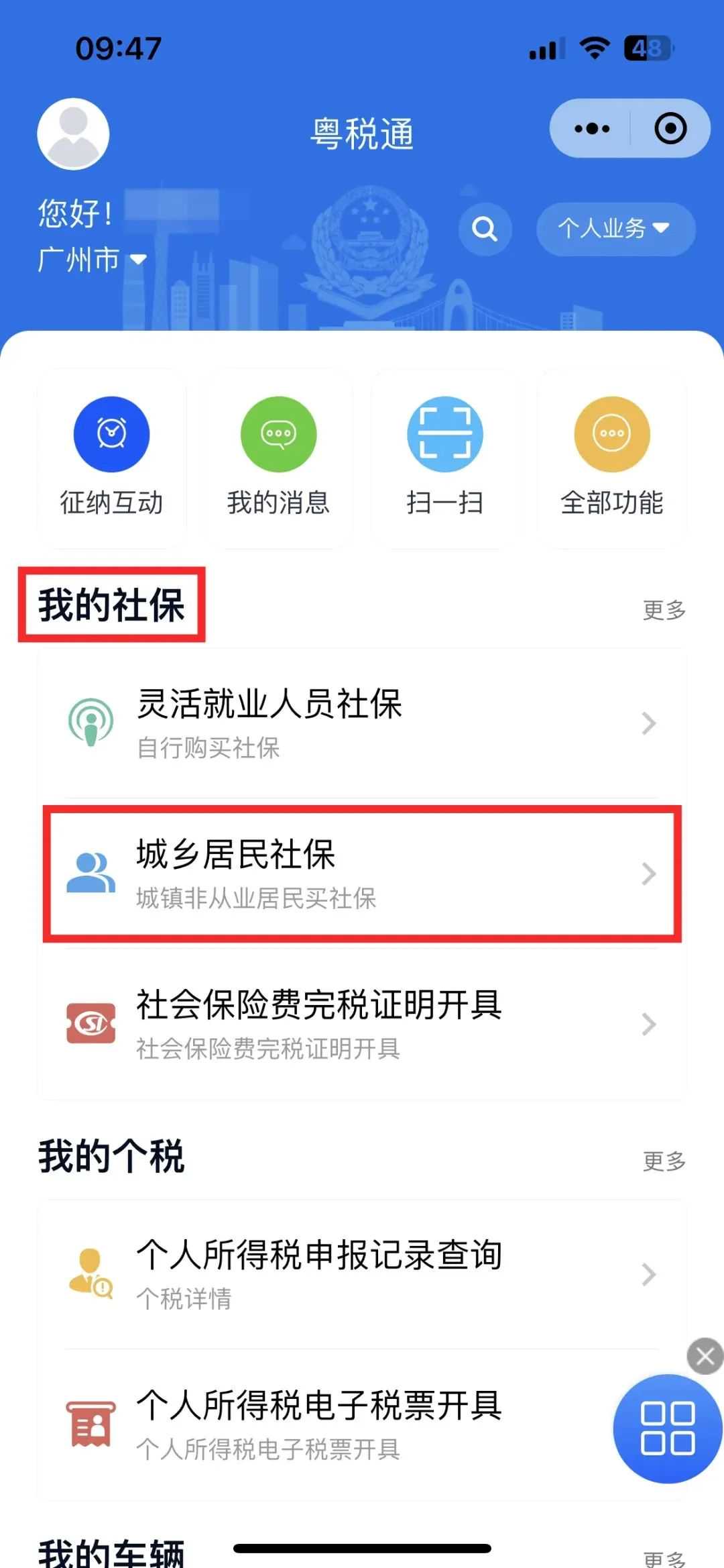 微信搜索“粤税通”小程序→注册并完成实名认证→我的社保-城乡居民社保→城乡居民社保费清缴,选择为本人或代他人缴费。