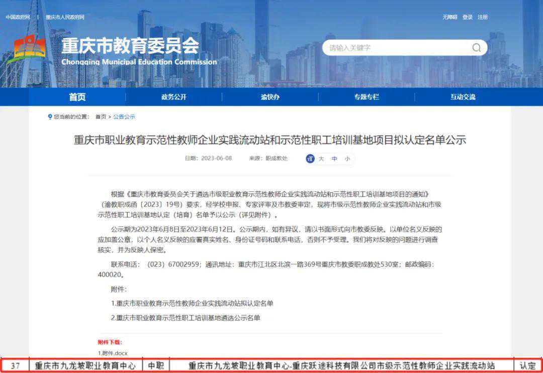 2023年6月8日,重庆市教育委员会发布《重庆市职业教育示范性教师企业实践流动站和示范性职工培训基地项目拟认定名单公示》。跃途科技凭借出色的技术研发水平以及多年产教融合的经验,经过专家评审及市教委审定,成功获批重庆市教委“示范性教师企业实践流动站”认定。