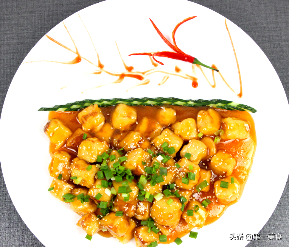 出锅配上之前的摆盘后,再撒上葱花和炒熟的白芝麻点缀,这道酸脆可口入口即化的烧托豆腐就做好了。
