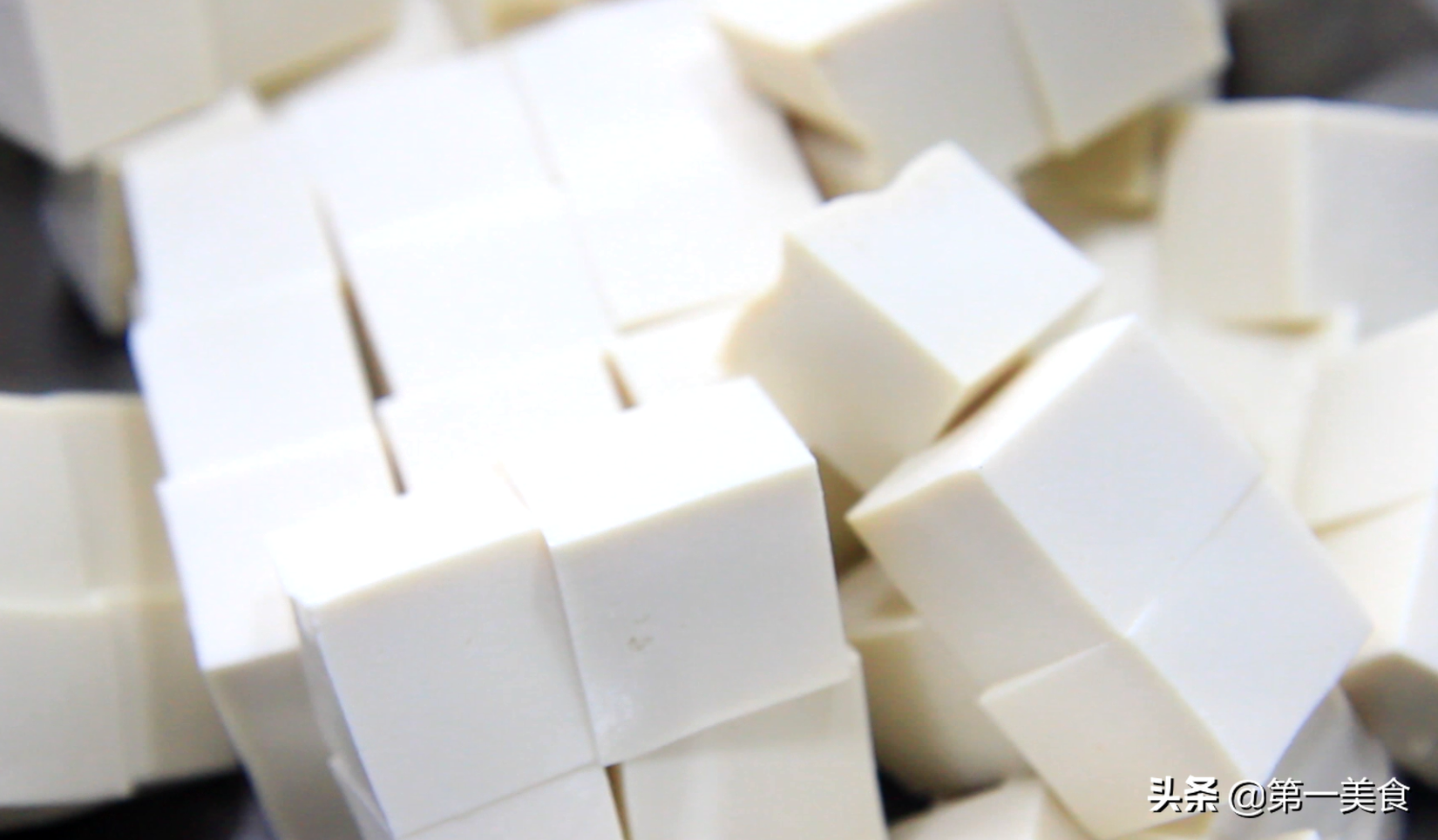 先把嫩豆腐切成方丁,这里为了避免沾刀,要从反面切,先切片再切丁,可以切的小一点。