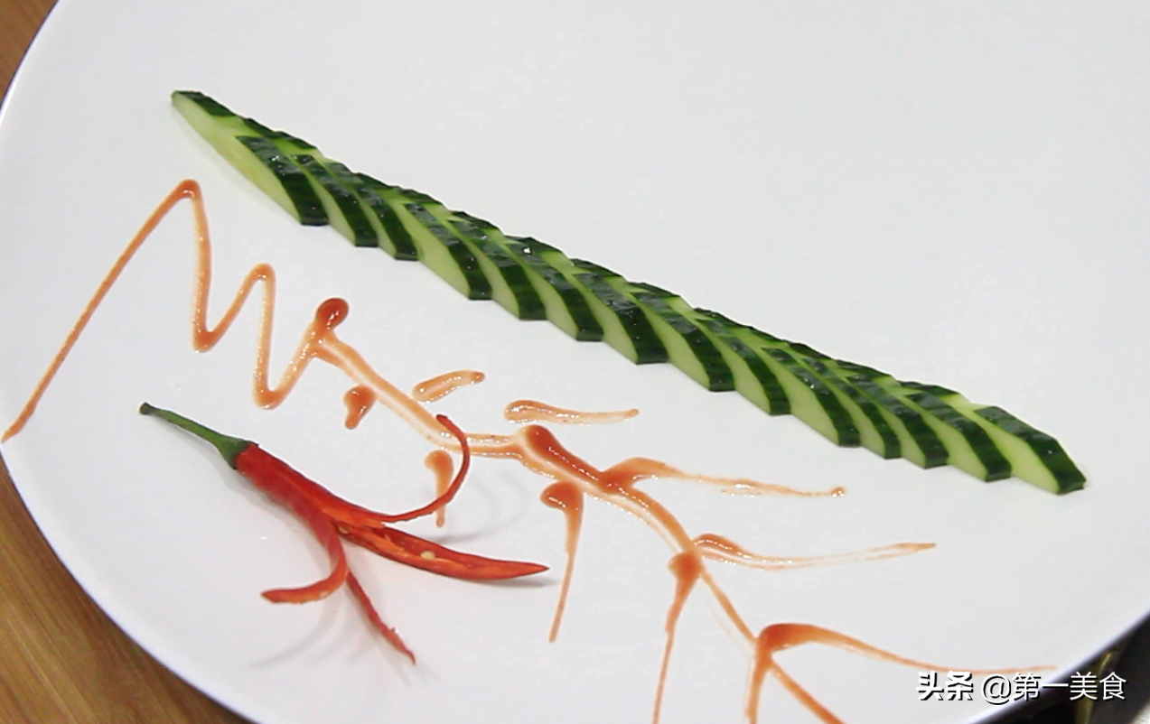 因为要用到黄瓜和尖椒摆盘起到点缀作用,所以把黄瓜切片,尖椒切至分散,类似于裙摆以后放在盘中备用。
