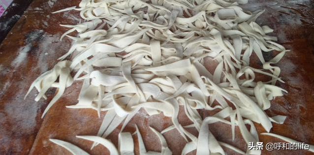 7,烧水期间我们擀面条,先擀成薄饼,然后用刀划成10厘米的长条,每层撒上面粉,叠起来,然后切成2厘米长条或三角形。抖散,防止粘连。