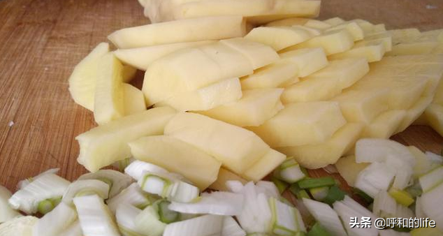 3,醒面的时候我们准备配菜,葱姜蒜切碎,西红柿切丁,土豆切1厘米左右的条。
