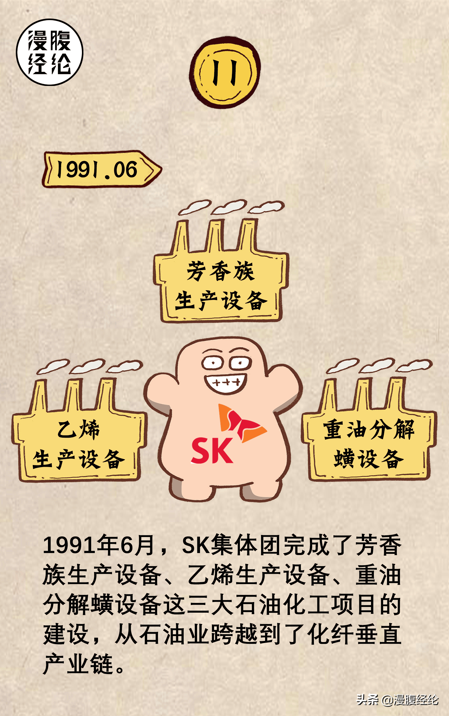 --1991年6月,SK集体团完成了芳香族生产设备、乙烯生产设备、重油分解蟥设备这三大石油化工项目的建设,从石油业跨越到了化纤垂直产业链。