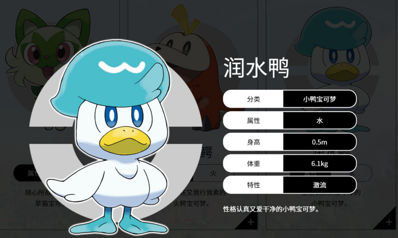 如果不是最终形态差异很大的话,润水鸭可能是这代御三家当中,属性非常明显的一个,看起来是比较标准的水系+飞行的属性。如果是单水系的话,可能就要看第八世代的御三家那样,有强大的特性和专属招式了。不过润水鸭的最终形态,有可能是和舞天鹅有点像的,在第五世代鸭宝宝的最终进化形态就是舞天鹅,外形上也可能差的不是很多。这是关于润水鸭的进化方向的猜想,如果是这个属性抗性还是不错的,只是需要注意下岩石和电系伤害。