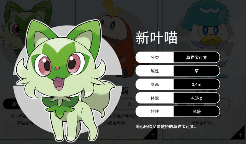 到目前为止,新叶喵在此次御三家当中的人气还是非常高的,光从外表来看确实还是很可爱,爱撒娇又随心所欲,可以说确实符合一些喵咪的特征。不过希望这代的御三家,还是设定为四足兽形的会好点,之前的咆哮虎和阿尔宙斯的狙射树枭,确实从外表看起来就不是那么的好,希望官方能够把这代的御三家们设定的漂亮一点。猜测一下第二属性可能会是格斗、妖精或恶,具体的就要看官方把新叶喵设定成为什么样子的存在了。