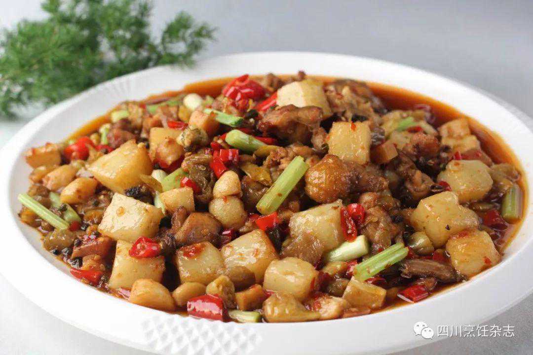 2.净锅注入熟菜油烧热,下入鸡块煸炒至表面微黄且硬挺时,放入干青花椒、泡青菜梗条、泡子姜粒、泡萝卜粒、大蒜瓣、泡红小米椒节、泡青小米椒节、郫县豆瓣和泡辣椒末炒香出色。掺少量清水,下入米凉粉块,调入盐、料酒、味精、鸡精和白糖,用中火收至汁水将干且入味时,倒入芹菜节并淋入山胡椒油推匀,出锅装盘即成。