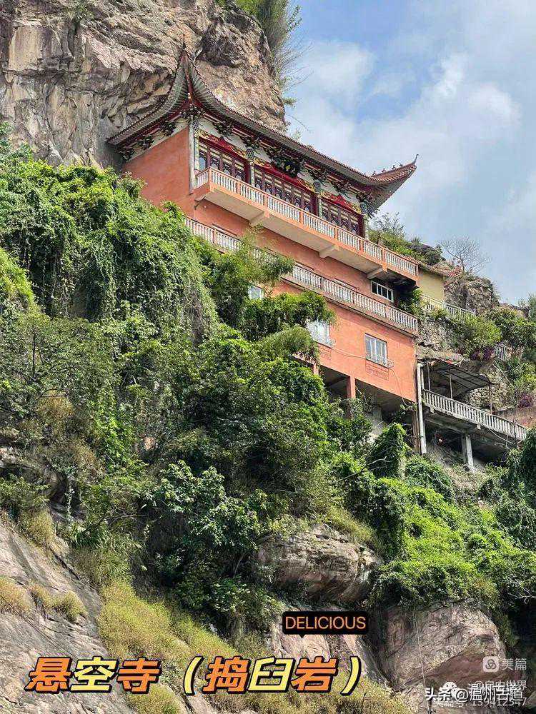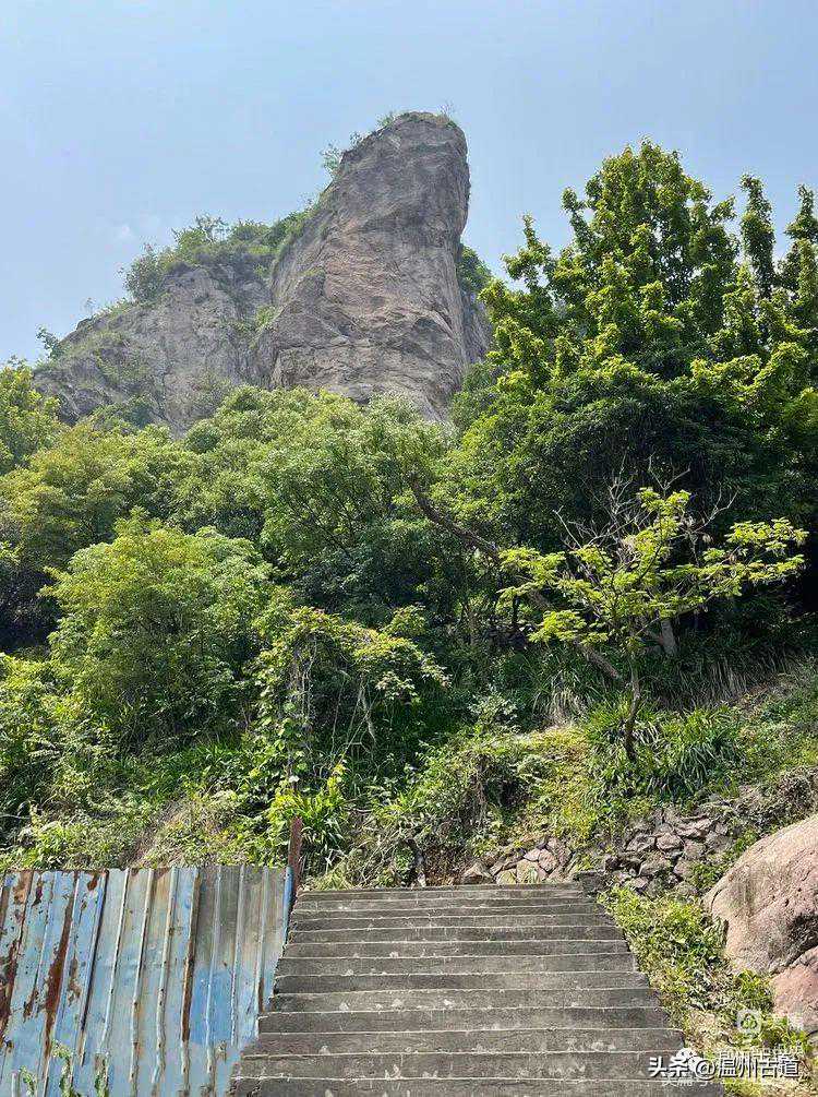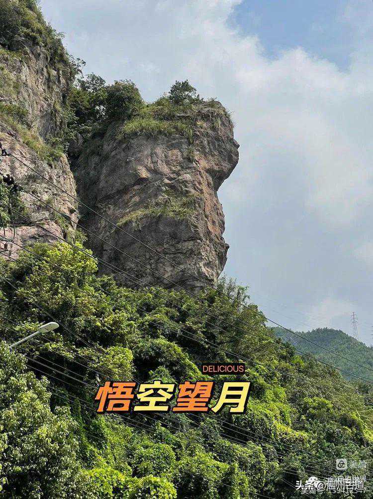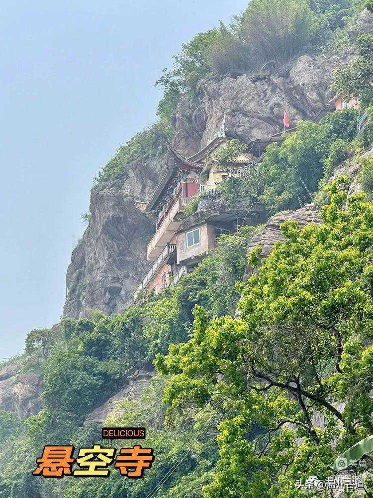 霞林与吴岙之间需走一段公路,为了方便下山直接开车,我们将车停在吴岙小区。公路上可以看到悬空寺(真名修性寺,因建在悬崖峭壁之上,俗称悬空寺)。同时可以看到“悟空望月”。