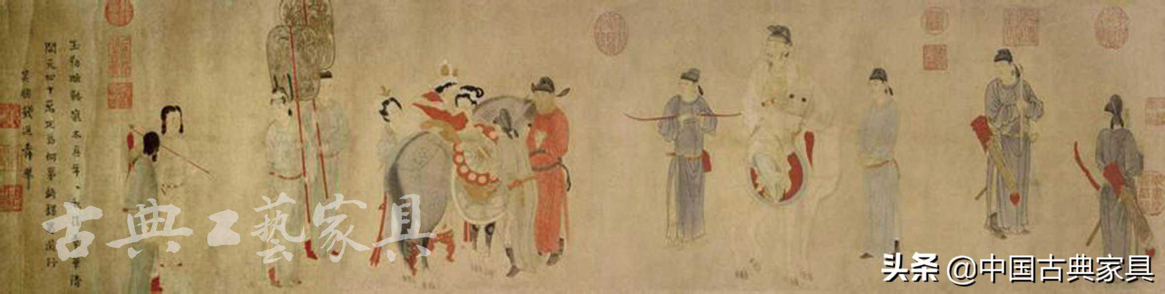 所谓“杌凳”晚明有“焦太史”之称的焦竑(1540~1620年)曾撰《养正图解》以为太子朱常洛(后来的明光宗)出阁讲学,其中的《辟馆亲贤》(图5)以唐太宗当年辟弘文馆置四书经籍并召文学之士虞世南、欧阳询等人入馆商榷政事为例,只见所绘“唐太宗”高坐交椅上,左右文学之士如燕翅般两溜排开,俱坐于一式低矮的圆杌上。一般腿足略长、供上下马踩踏用时,杌又称“马杌”。传为元代钱选所作的《杨妃上马图》(图6),画中的“杨妃”在宫人的搀扶下正踩着一只曲腿圆凳上马。