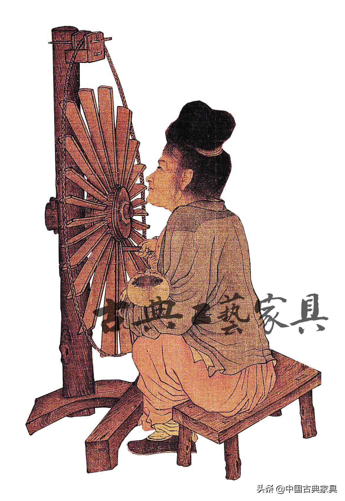 “杌”为单片木板下接四根腿柱的组合,是无扶手、无靠背的木制坐具(图2),有时就叫“杌子”、“小杌子”,经常与凳连称“杌櫈”,两者功能、造型略同。小杌子高矮略有所差,座面有方有圆,因此有方杌、圆杌之分。北宋人王居正有一幅《纺车图》,画中村妇直身所坐素木无漆,卡榫构造非常清楚,就是小凳子(图3),此村妇怀抱婴儿,一手摇纺轮,腾出另一手哺乳喂婴,反映凳子是简便普及的庶民坐具。