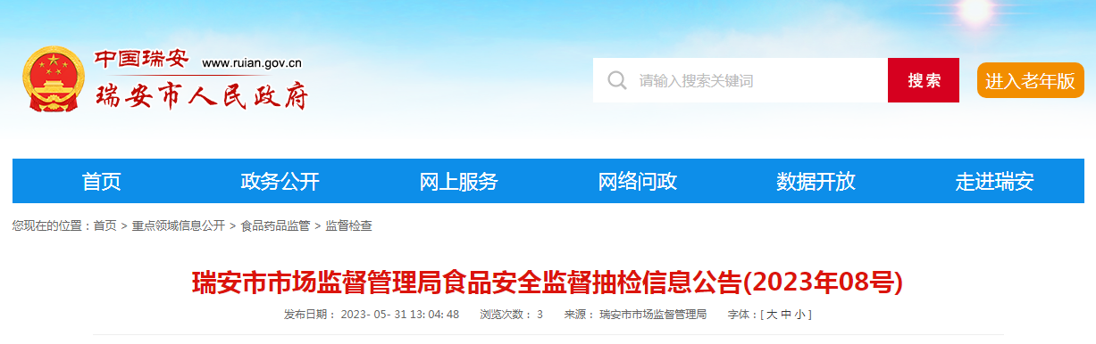 中5月31日,浙江省瑞安市市场监督管理局发布2023年8号食品安全监督抽检信息。