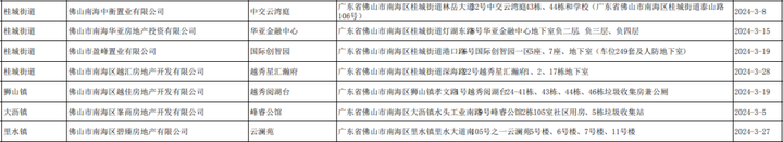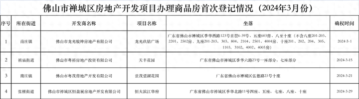 其中,禅城区3月确权的项目共有4个,分别包括有南庄的龙光玖龙臺首层6-39号、五座603房、八至十座,世茂弘阳绿岛湖公馆十座,石湾的天丰誉城一座部分、七座部分和张槎的恒大滨江华府四座、五座、七座、八座、十座。
