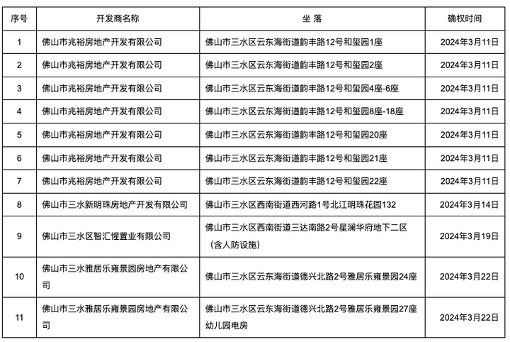 三水3月则有4个项目确权领证,分别为建发融创雅居乐和玺1-2/4-6/8-18/20-22座,北江明珠132、碧桂园印象北江的停车场和雅居乐雍景园24和27座。