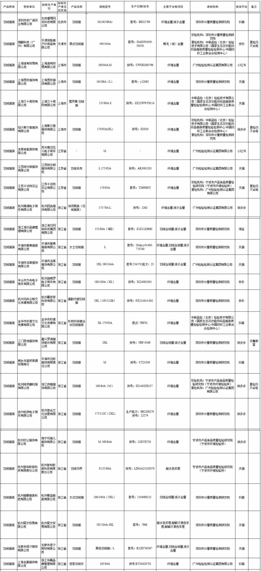 26批次羽绒服装不合格