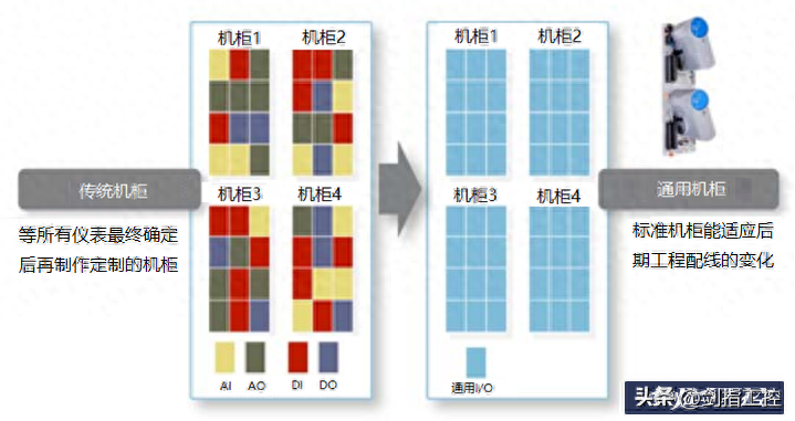 如同显示仪的万能输入功能可以减少设计选型的工作量一样,控制系统通用I/O技术也可以减少设计选型的工作量。设计过程不考虑选哪种I/O模块,可以就近将各类I/O点集中安装到一个配线柜或仪表箱,同时配线柜或仪表箱的出线端子接线已经汇聚成总线方式传输,不必一根根再标注出线的编号,图纸绘制、审核、校对工作量也大大减少。图30对比了传统机柜与通用机柜I/O模块配置示意图,传统机柜中代表各种I/O模块的不同色彩混合配置,需仔细设计及核对确认,而通用机柜I/O模块配置是一种色彩表示的单一配置,除数量外,无需设计及核对确认。