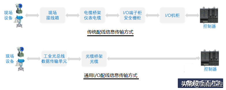 图32传统配线信息传输方式与通用配线I/O信息传输方式比较初期艾默生的电子布线技术介绍的是集中配线柜,后期又推出就地安装的小型现场仪表箱,而绝大多数厂家首先推出的就是就地安装的小型现场仪表箱。应该说,这代表了通用I/O技术的发展方向。
