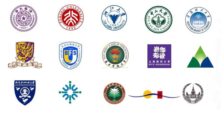 北京外国语大学、浙江大学、中山大学、华南理工大学、南方科技大学、西交利物浦大学、北京师范大学-香港浸会大学联合国际学院、上海纽约大学、昆山杜克大学、香港中文大学(深圳)、深圳北理莫斯科大学