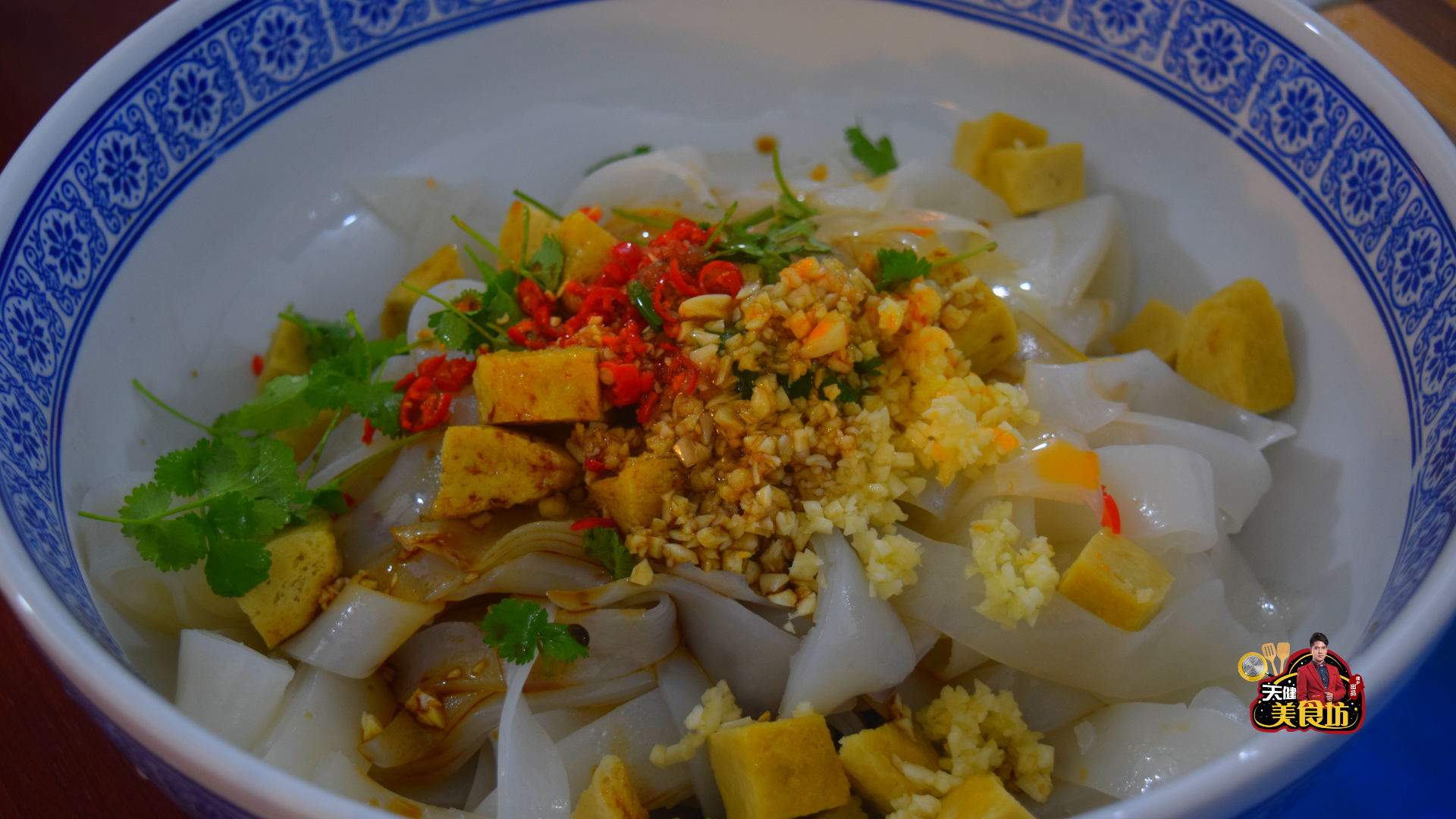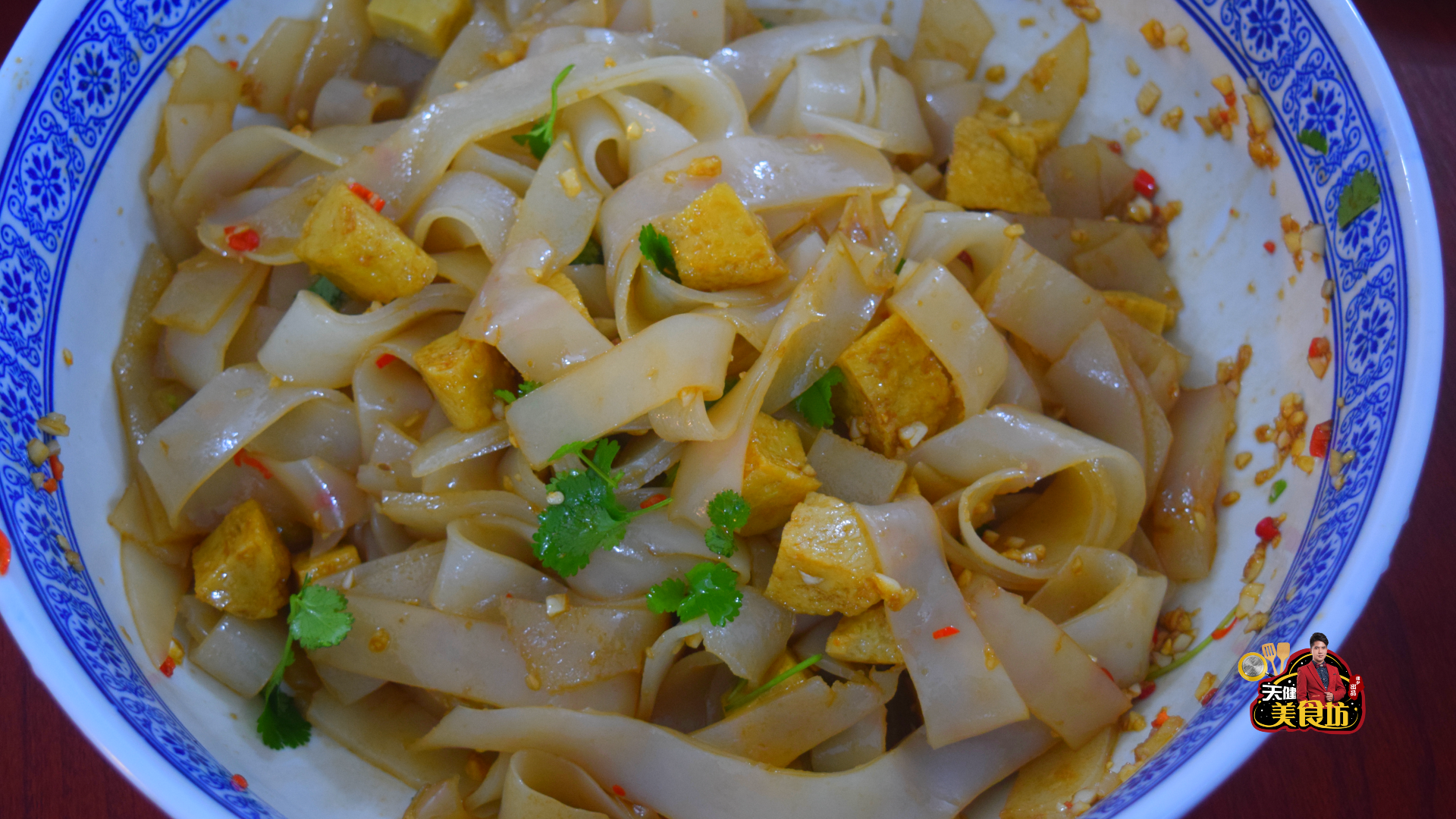 第六步:将切好的凉皮放入大汤盆里面,再将准备好的大蒜拍扁剁碎,将小米椒切碎,将香菜切碎,一起放入装有凉皮的汤盆里面,再加入半茶匙食盐,加入3汤匙生抽,加入2汤匙陈醋,加入2汤匙花椒油,加入2汤匙辣椒油,然后用筷子搅拌均匀,就可以开吃了!