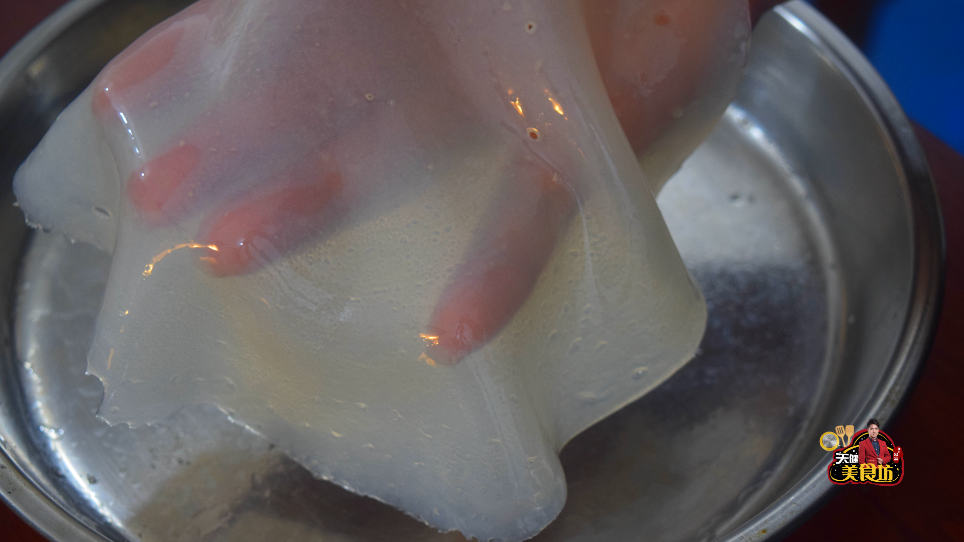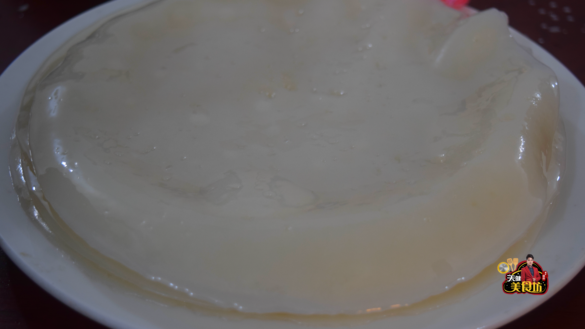 第五步:等淀粉沉淀之后,将多余的水倒掉,水量剩下距离淀粉1厘米高就差不多了,然后用勺子搅拌均匀,成为浓稠的淀粉水。再准备一个平底的盘子,先在盘子底下刷上一层植物油,再上2勺的淀粉水,然后晃平,再放入开水锅里飘着,再盖上盖子,蒸1分钟,凉皮熟透起泡后,就可以揭盖出锅了,再在蒸好的凉皮上,刷上一层食油防粘,放至不烫手后,从边上把凉皮给揭下来!