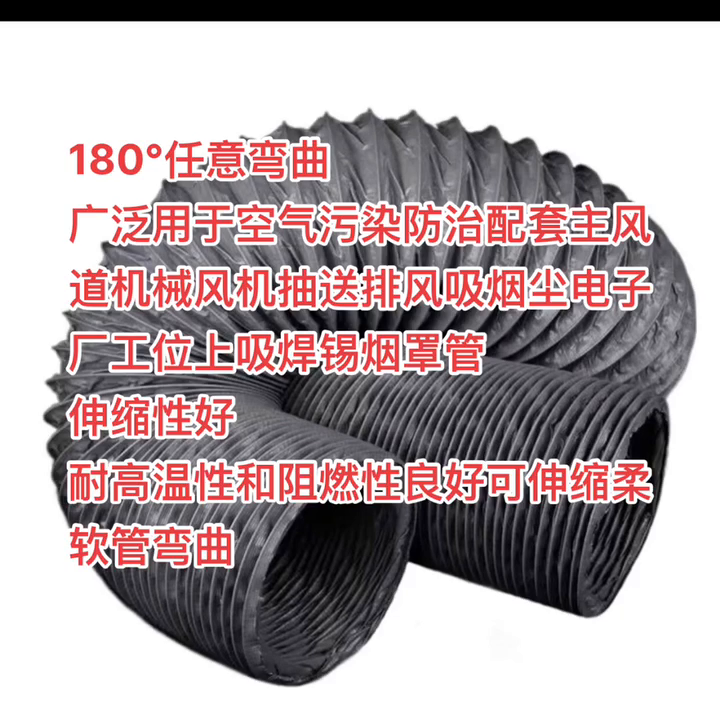 该产品的伸缩性好,能耐受高温和阻燃,同时可随意弯曲。其内部采用加粗的钢丝,外部包裹着厚实的布料,使用寿命更长。该产品的材质可在360度范围内自由弯曲,且可在180度范围内任意弯曲,广泛应用于电子厂等场所的吸焊锡烟罩管。