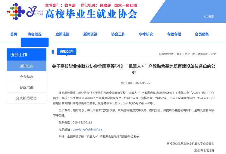 5月25日,高校毕业生就业协会机器人专业委员会公布了全国高等学校“机器人+”产教融合基地首批培育建设单位名单,山东劳动职业技术学院智能制造系与江苏汇博机器人技术股份有限公司联合申报的产教融合基地成功入围。