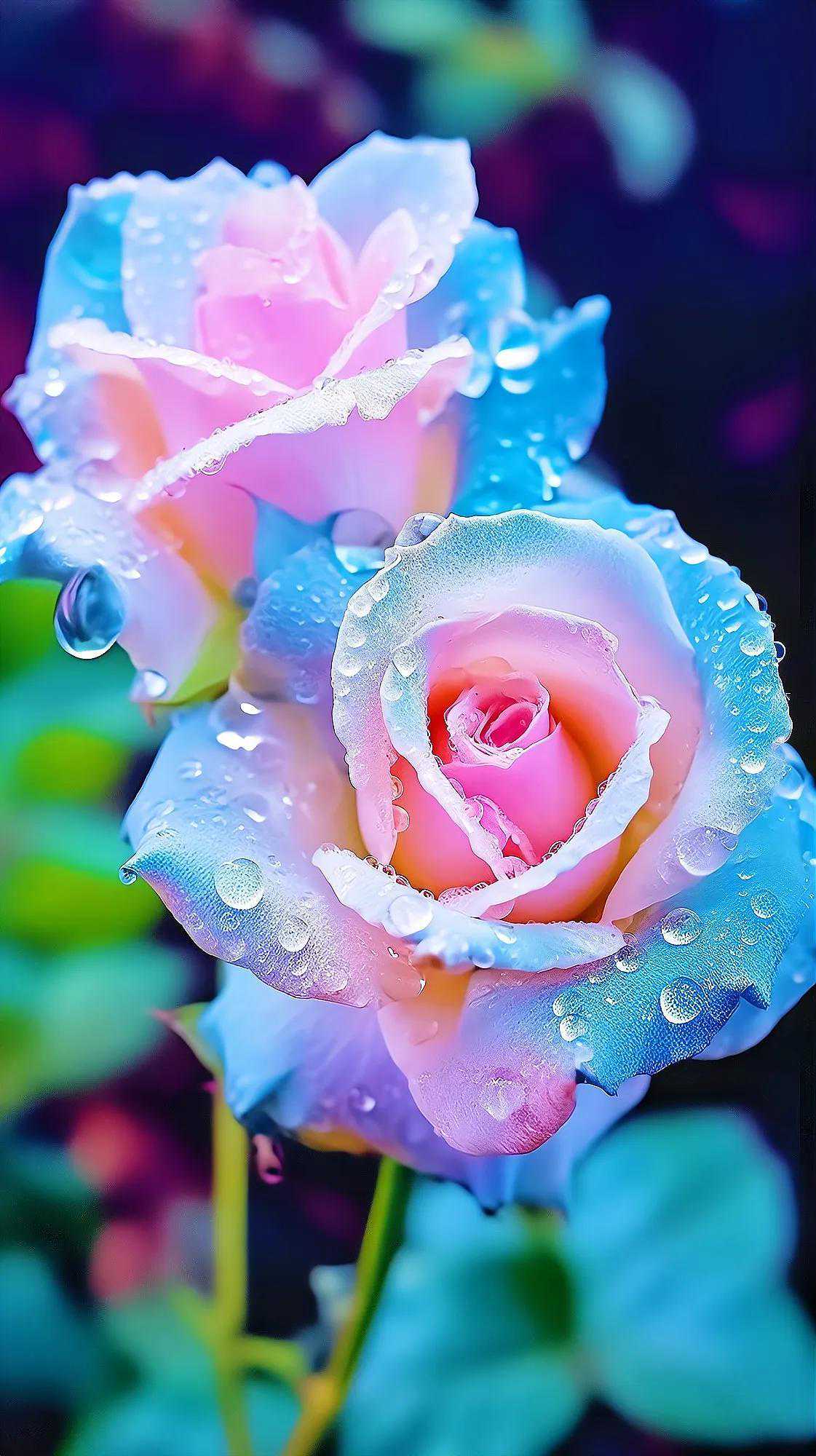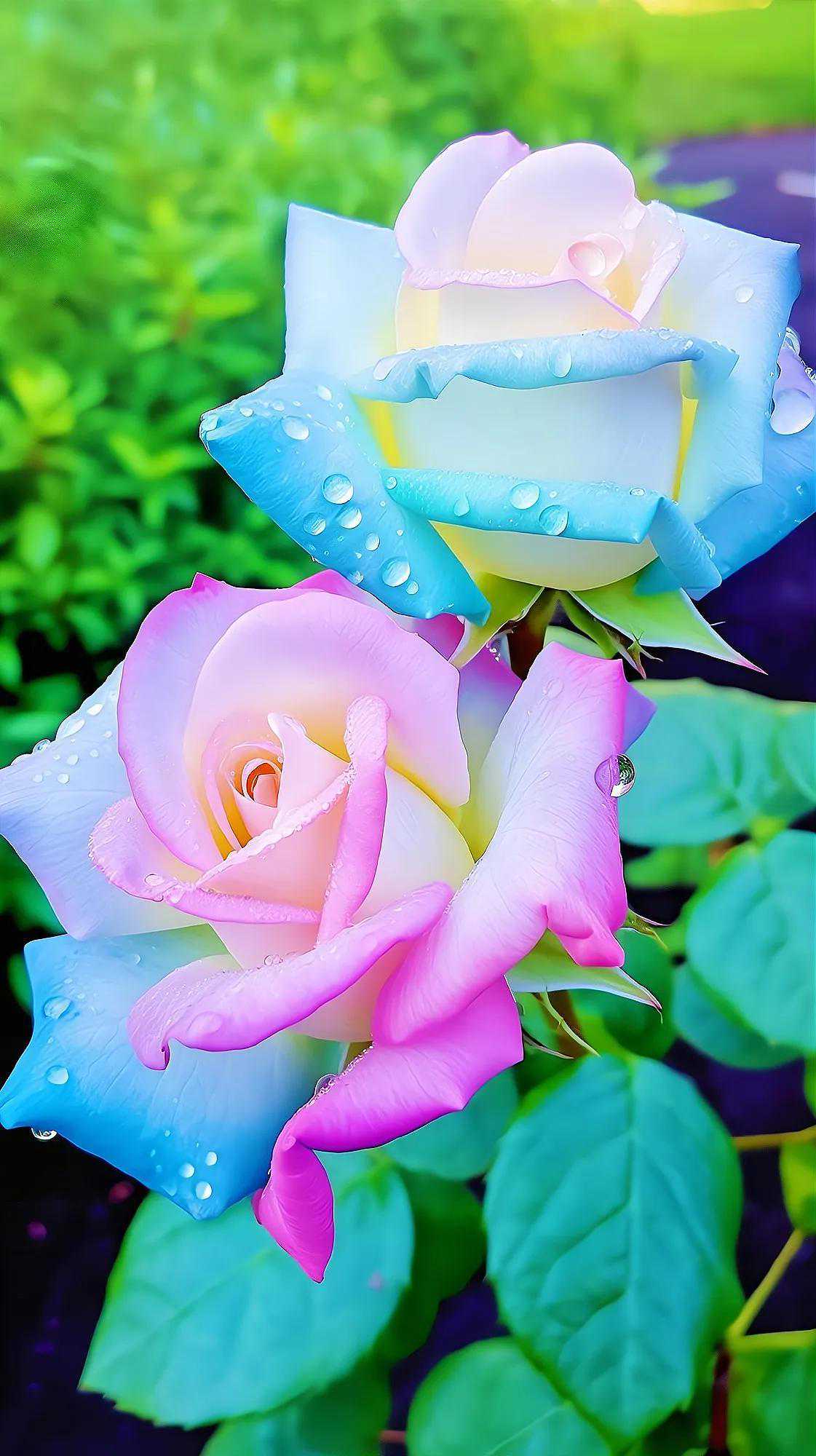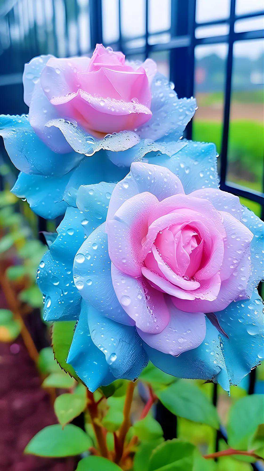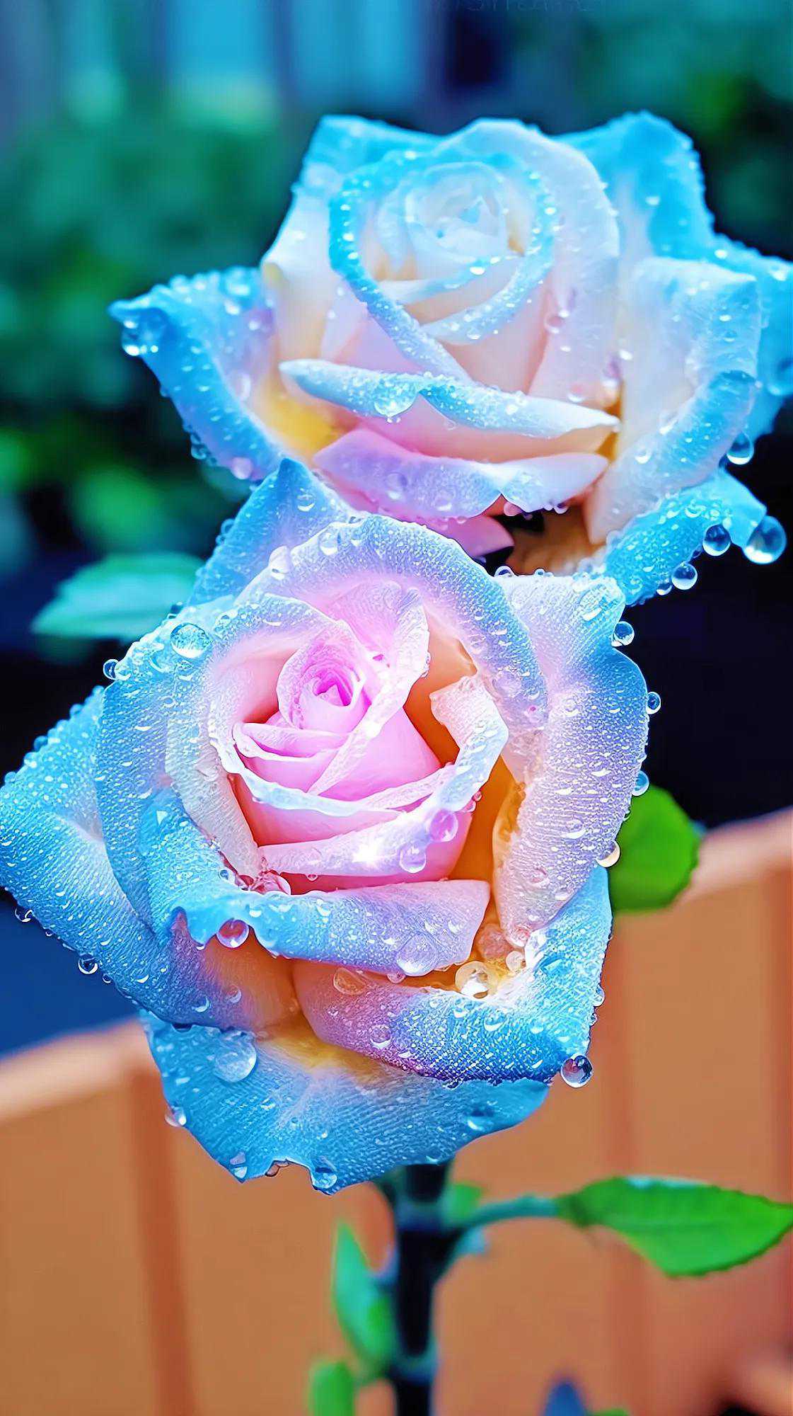 英文关键词:,twoTiffanydual-colorrosesinblue,pink,andyellowarebloomingonthefence,,andtheflowersoneachlayerofpetalsareclearandtransparent,hdefinition,16K.
