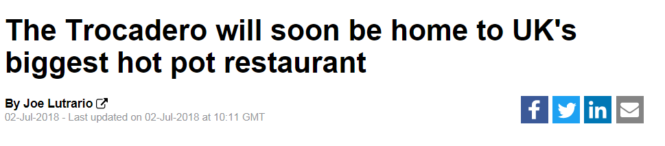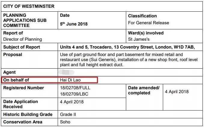 在威斯敏斯特区政府的公开文件中可以看到,海底捞将进驻伦敦soho区,租下的两层店面总面积达900多平方米,具体位置在皮卡迪利圆环Trocadero大街邻楼,毗邻中国城、苏荷区、特拉法加广场、牛津街,位于伦敦的核心商业地带。